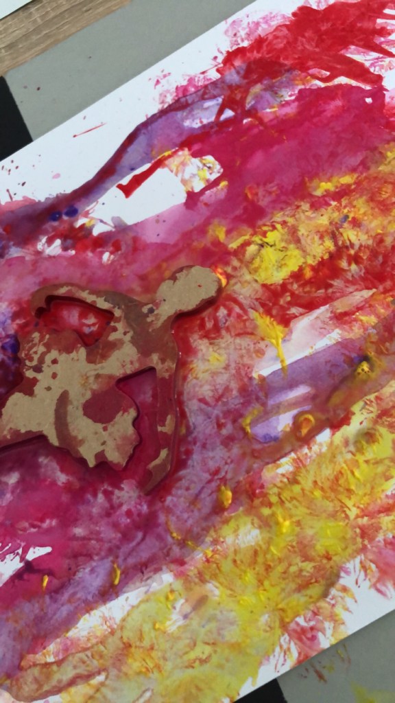 Le pochoir peut également être découpé dans une feuille blanche et collé pour couvrir la peinture. On peut aussi y faire une jolie grenouille tenant un parapluie par exemple. Vous aimez ?