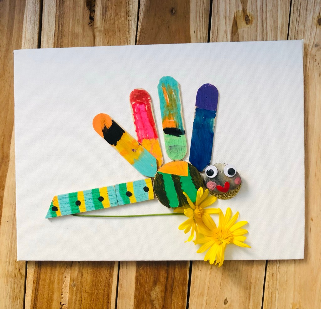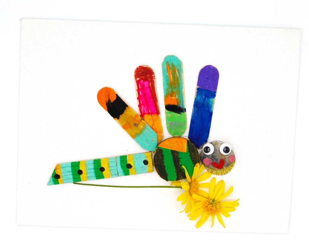 Les ailes sont faites avec des petits bâtonnets de glaces découpés, ainsi que la queue. Le corps est un petit rondin de bois, et la tête une gommette pailletée et un caillou. L’idée est de trouver des formes rondes dans la nature et les peindre au feutre Posca. Quelques fleurs collées et le tour est joué. La bouche est faite avec un coeur gommette collé à l’envers.
