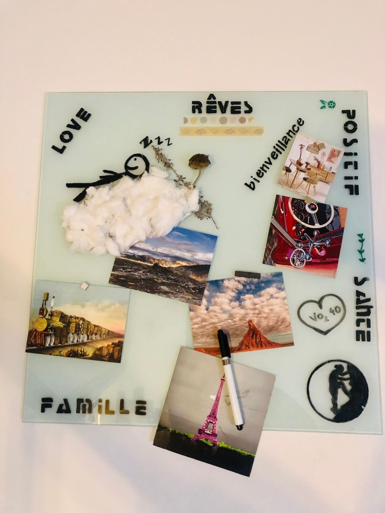 Le principe de ce tableau est de mettre en image pour visualiser vos rêves. Il y a de la place pour tout ceux de la famille. On part du principe de la loi de l’attraction. Le positif attire le positif, le visualiser en fait partie. Certains disent même qu’il a le pouvoir magique de les faire réaliser. On l’appelle aussi le ”vision board”. Osez y mettre tout vos rêves, vos objectifs et vos envies ! Le meilleur moyen pour exprimer ses objectifs, c’est de les visualiser !