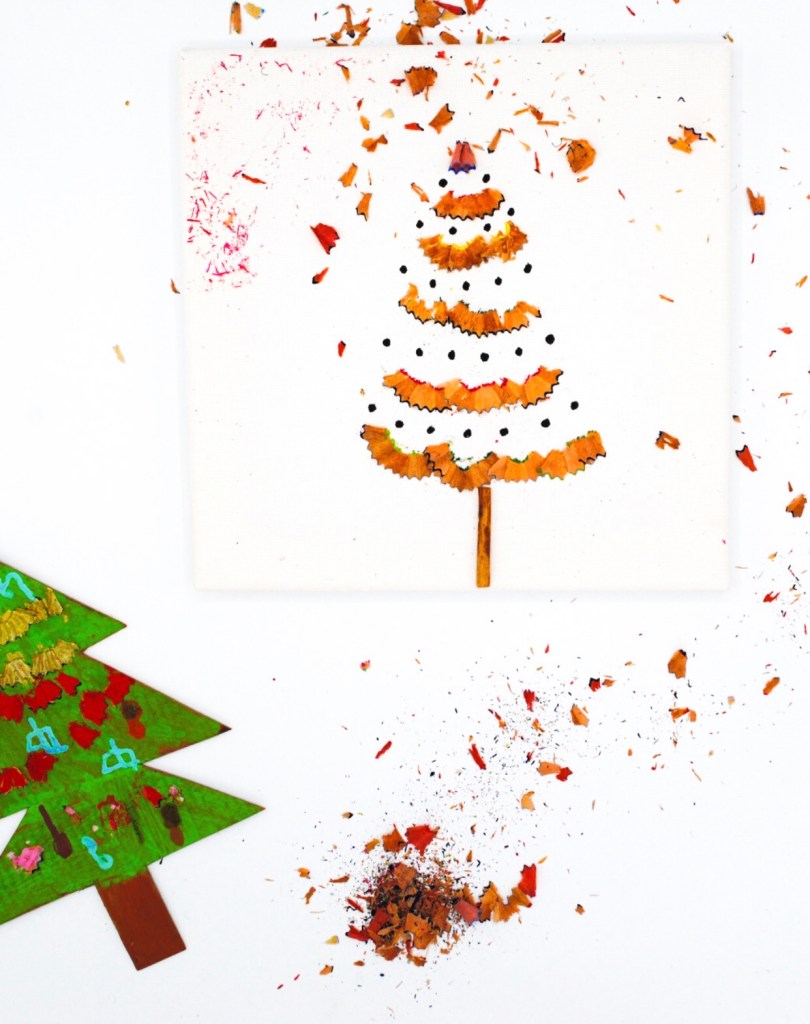 Le deuxième sapin est réalisé sur une toile. Commencez par appliquer la colle dans la forme où vous appliquerez ensuite les épluchures. Entre les petits points noirs sont faits au feutre Posca. Le tronc est une petite branche collée. Vous pouvez coller tout autour des éclats de crayons de couleurs.