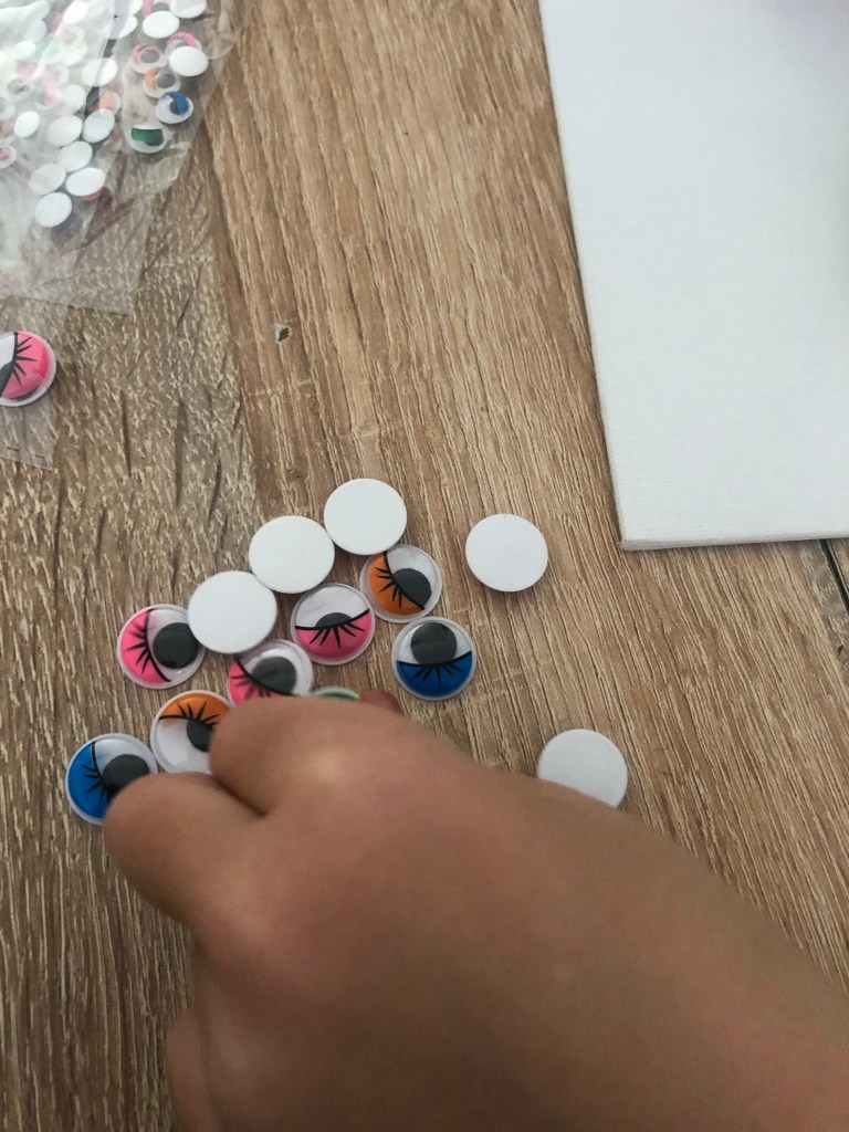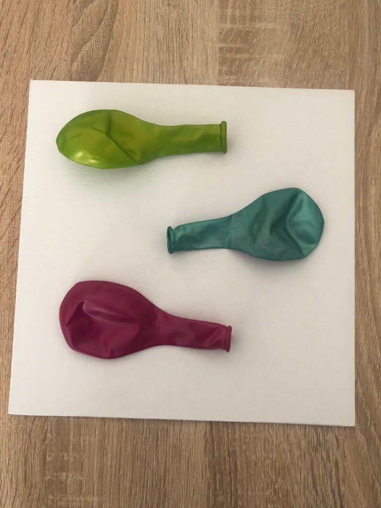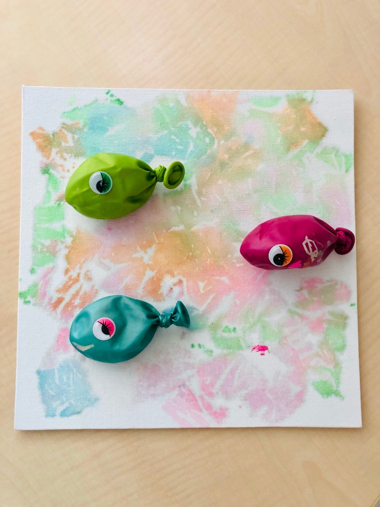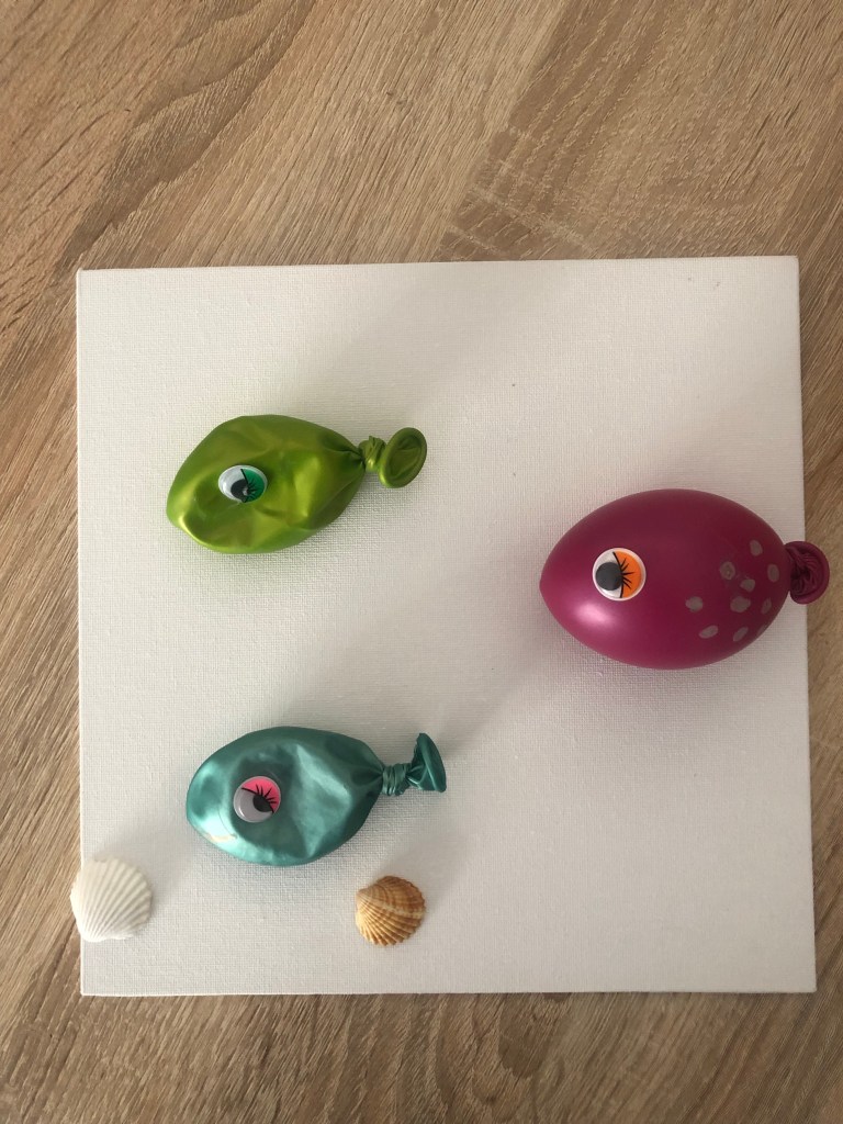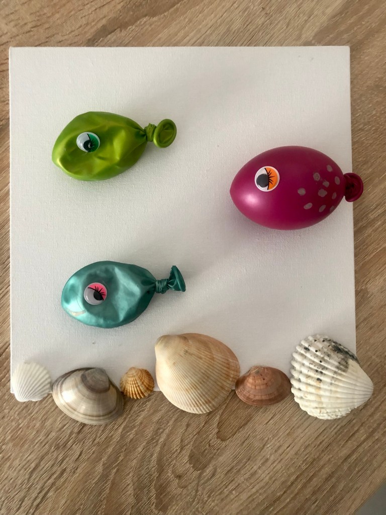 Placez des petits yeux, les ballons sont gonflés très légèrement et collés sur le support. Vous pouvez utilisez des techniques de peintures pour d’abord peindre la toile en fond de mer.