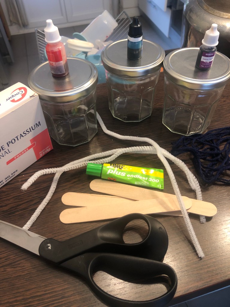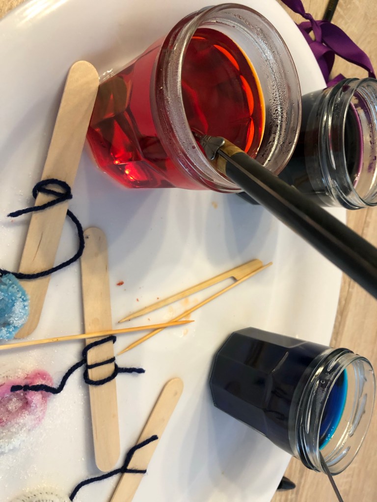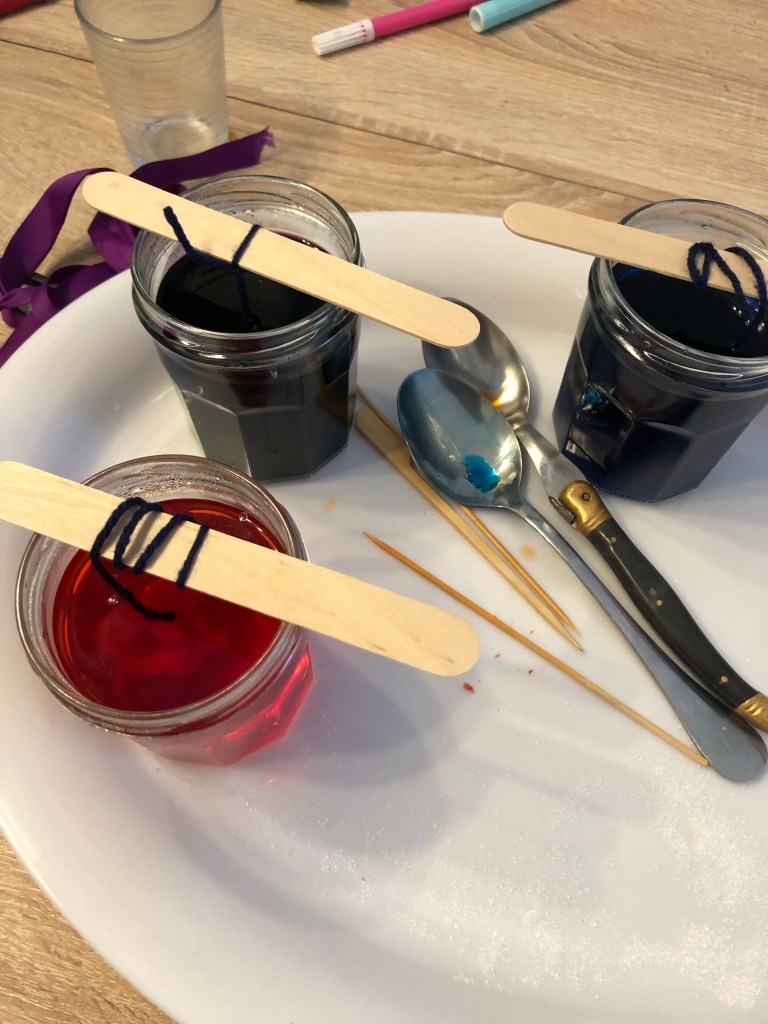 Y versez de l’eau obligatoirement portée à ébullition et ajoutez le colorant. Nous avons choisis de faire trois couleurs.