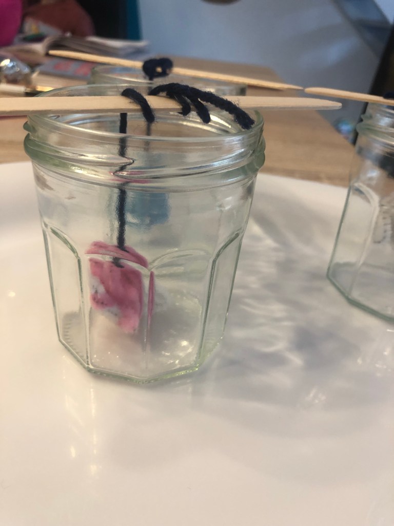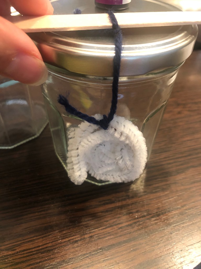 Attachez le ensuite à une ficelle et au bâtonnet de manière à ce qu’il ne touche pas le fond une fois dans le bocal.