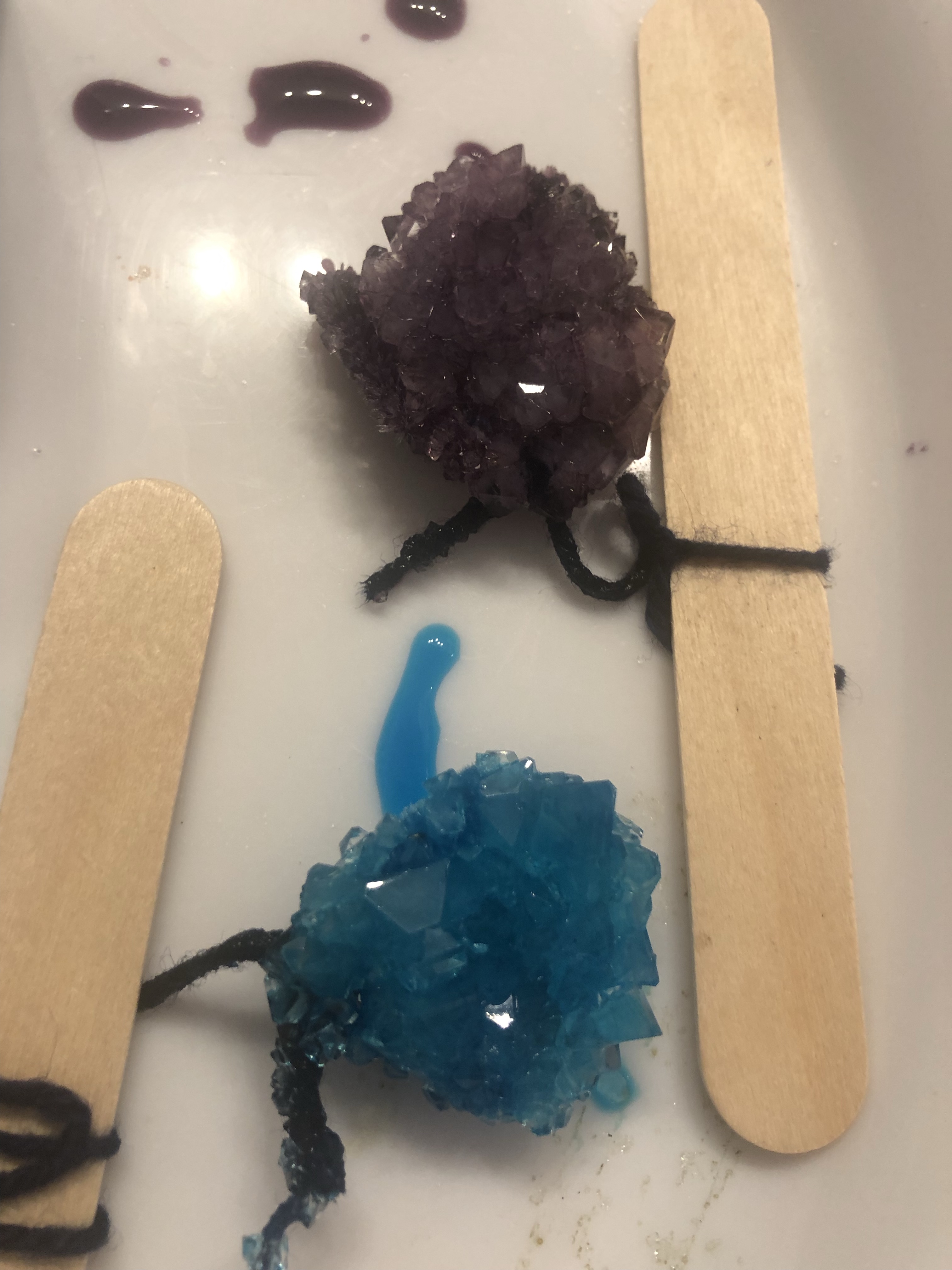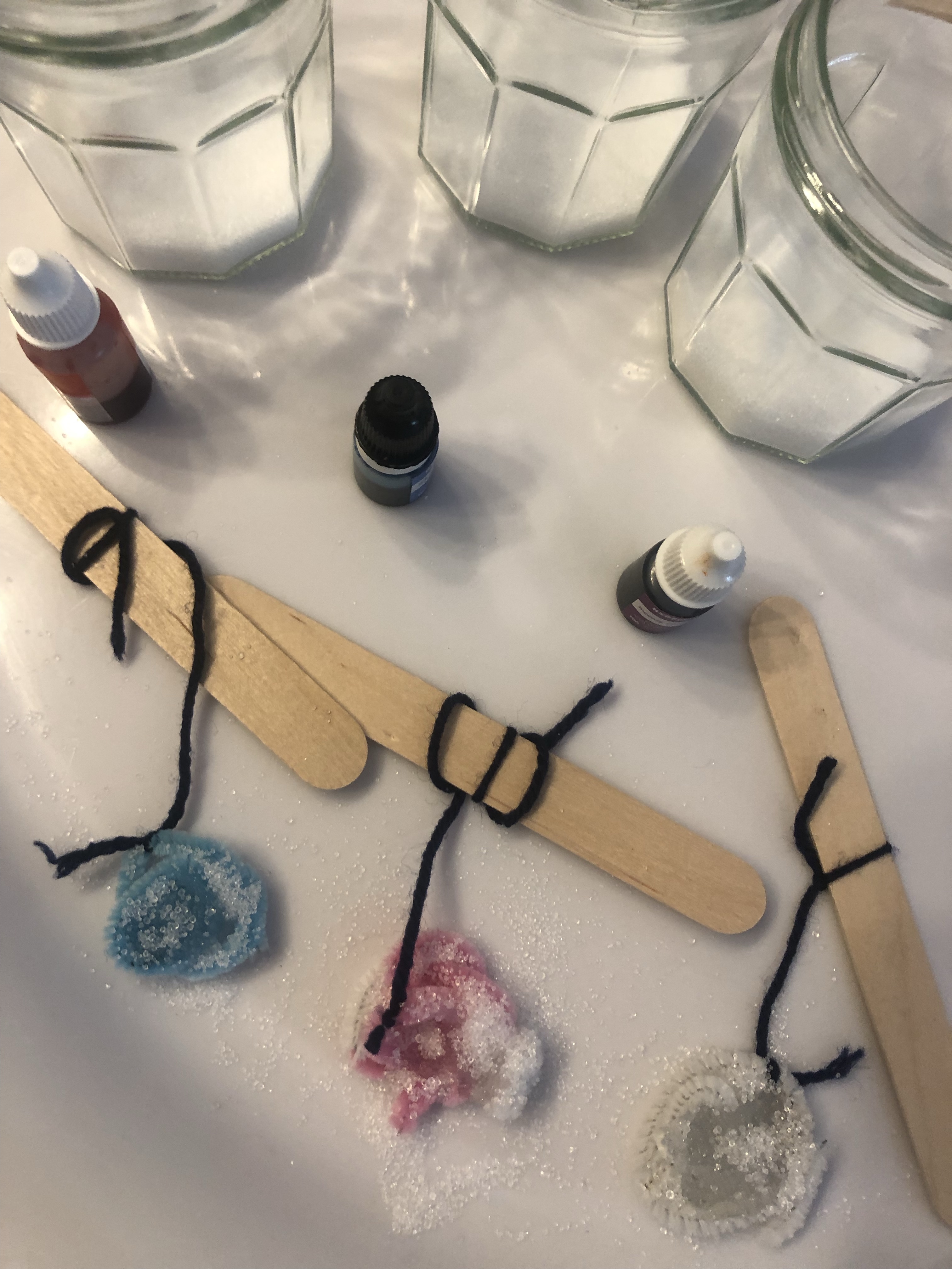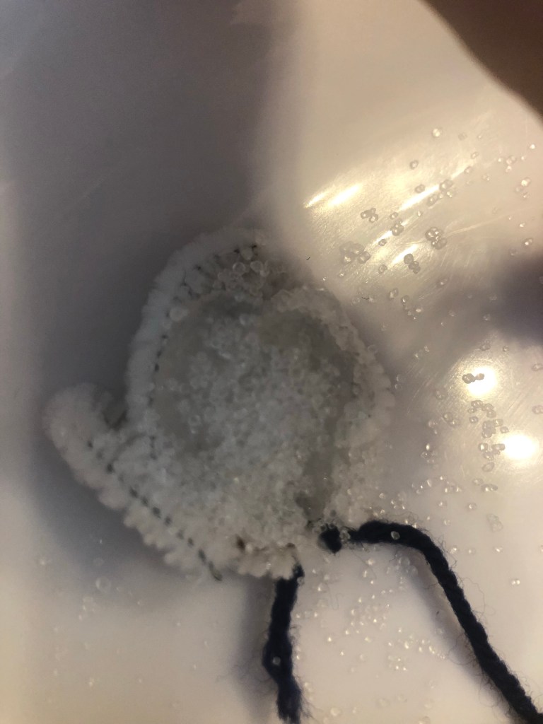 Disposez de la colle liquide sur le cotillon puis saupoudrez de la poudre d’Alun. Comptez environ deux heures de séchage. Cette étape n’est pas indispensable mais elle rend les cristaux plus jolis.