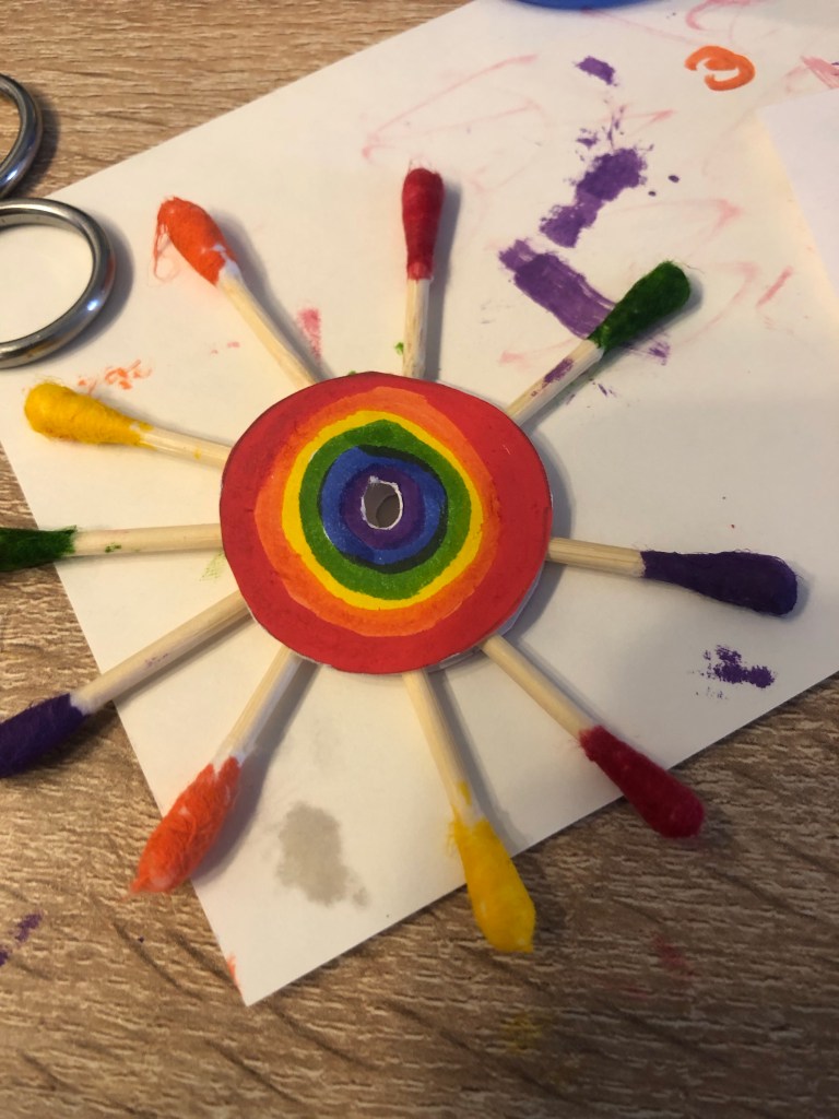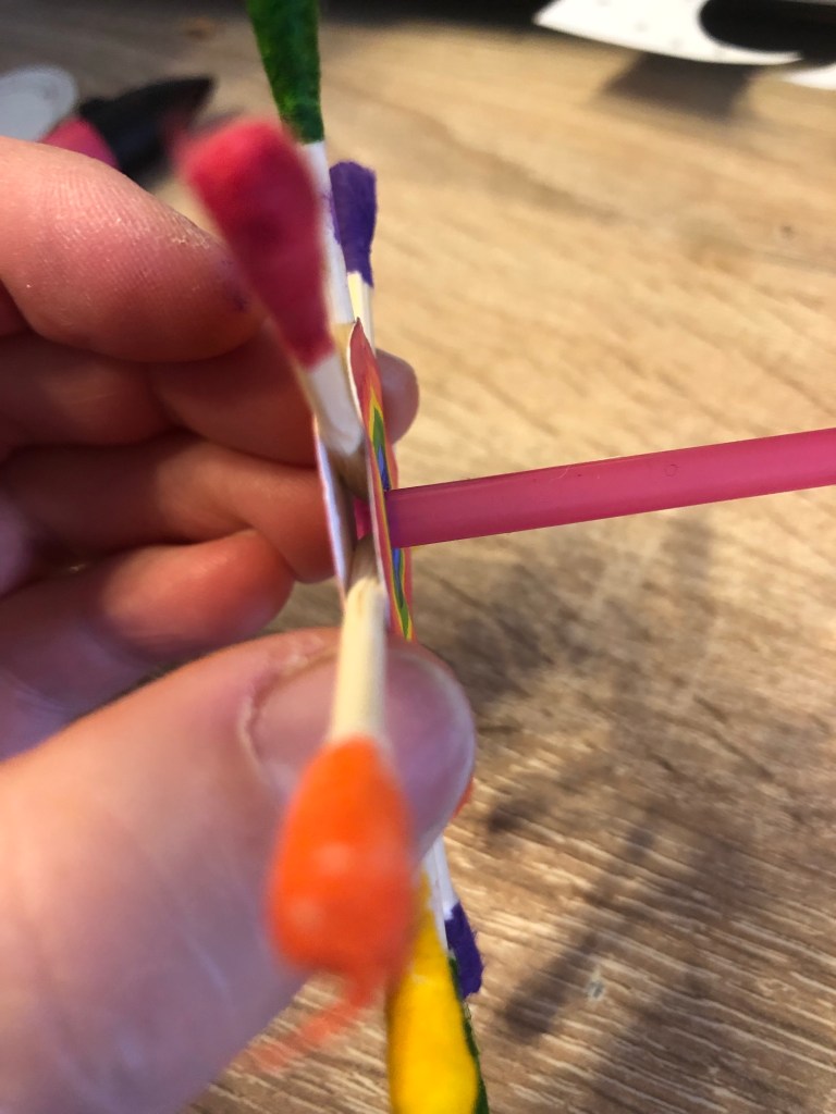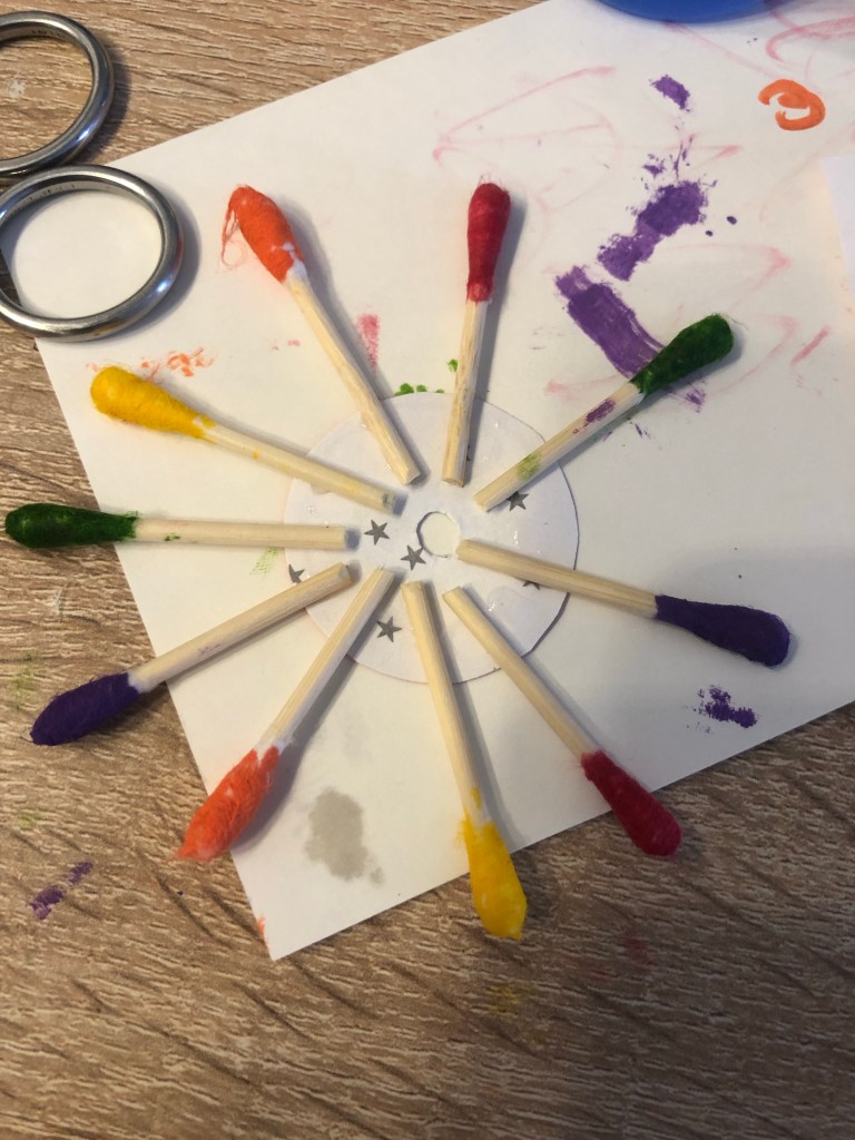 Coupez en deux les cotons tiges et peindre le bout avec des feutres type podcast par exemple. Les faire par deux
