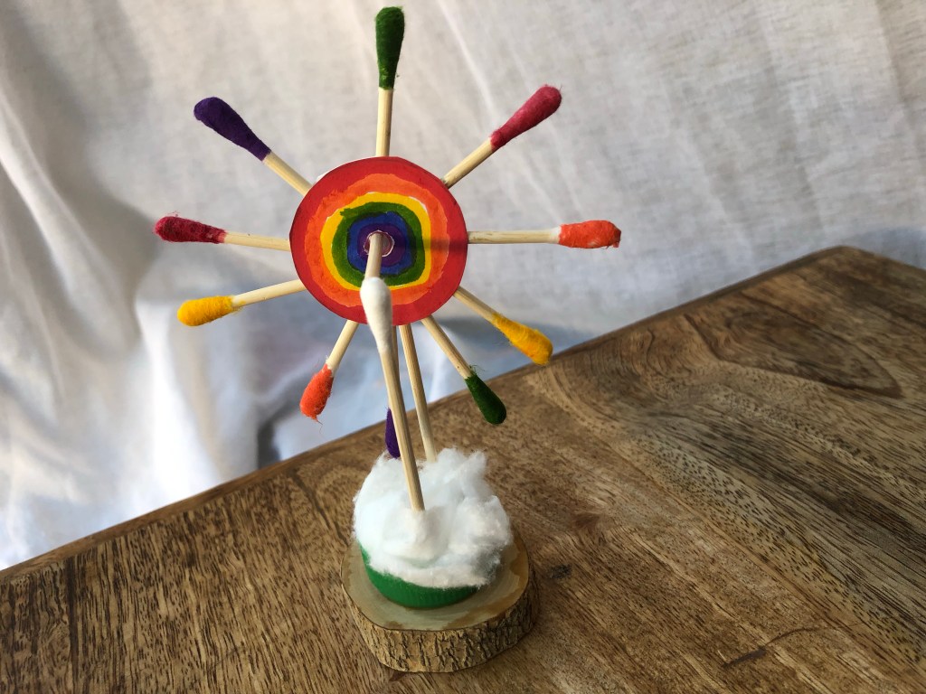 Montez le tout en collant entre eux les cotons tiges. Utilisez la largeur du bouchon. Pour plus de stabilité nous l’avons collé sur du bois, et rempli de coton pour le côté plus mignon