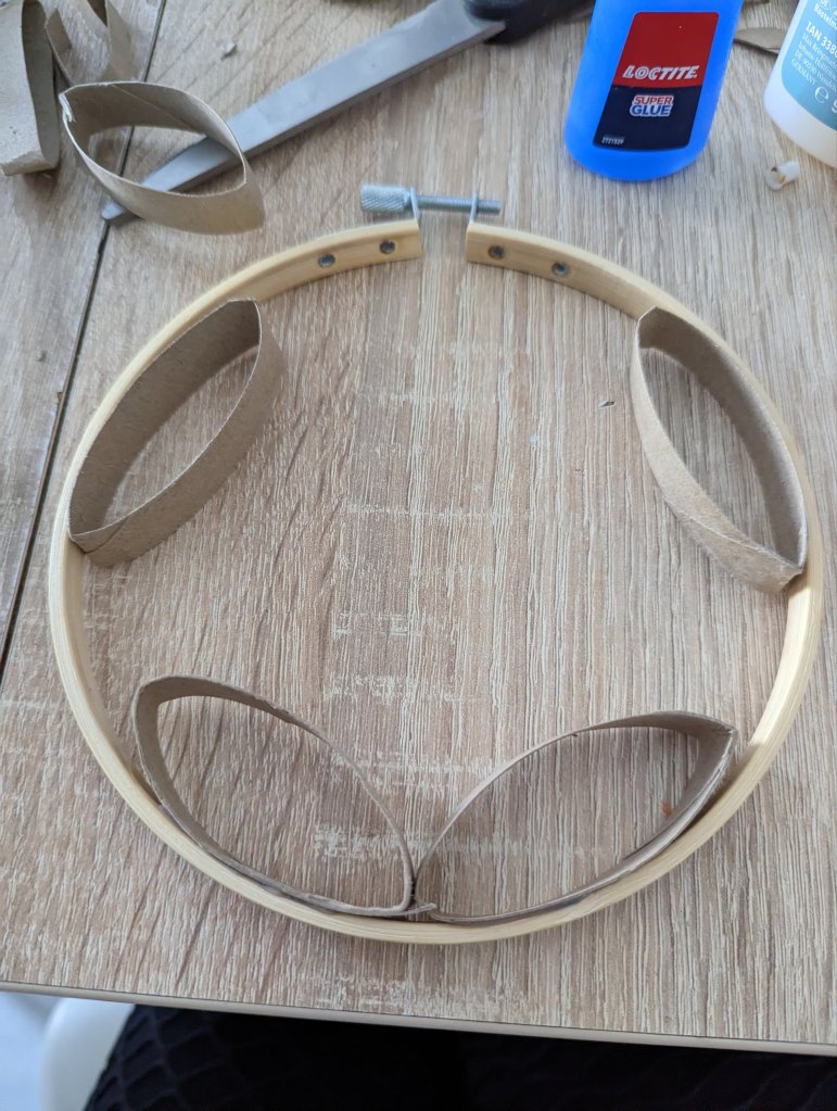 Nous avons utilisé ici un attrape rêve vendu en magasin de bricolage. Vous pouvez utiliser le tour en carton d’une boîte à camembert par exemple.