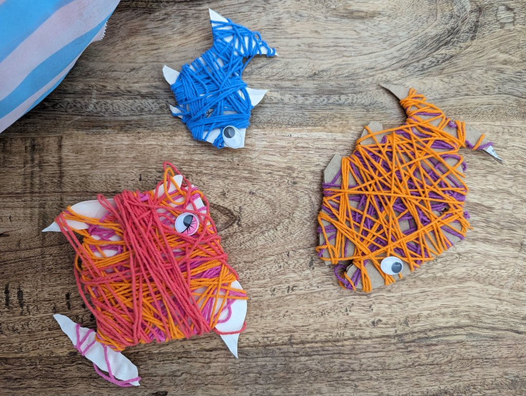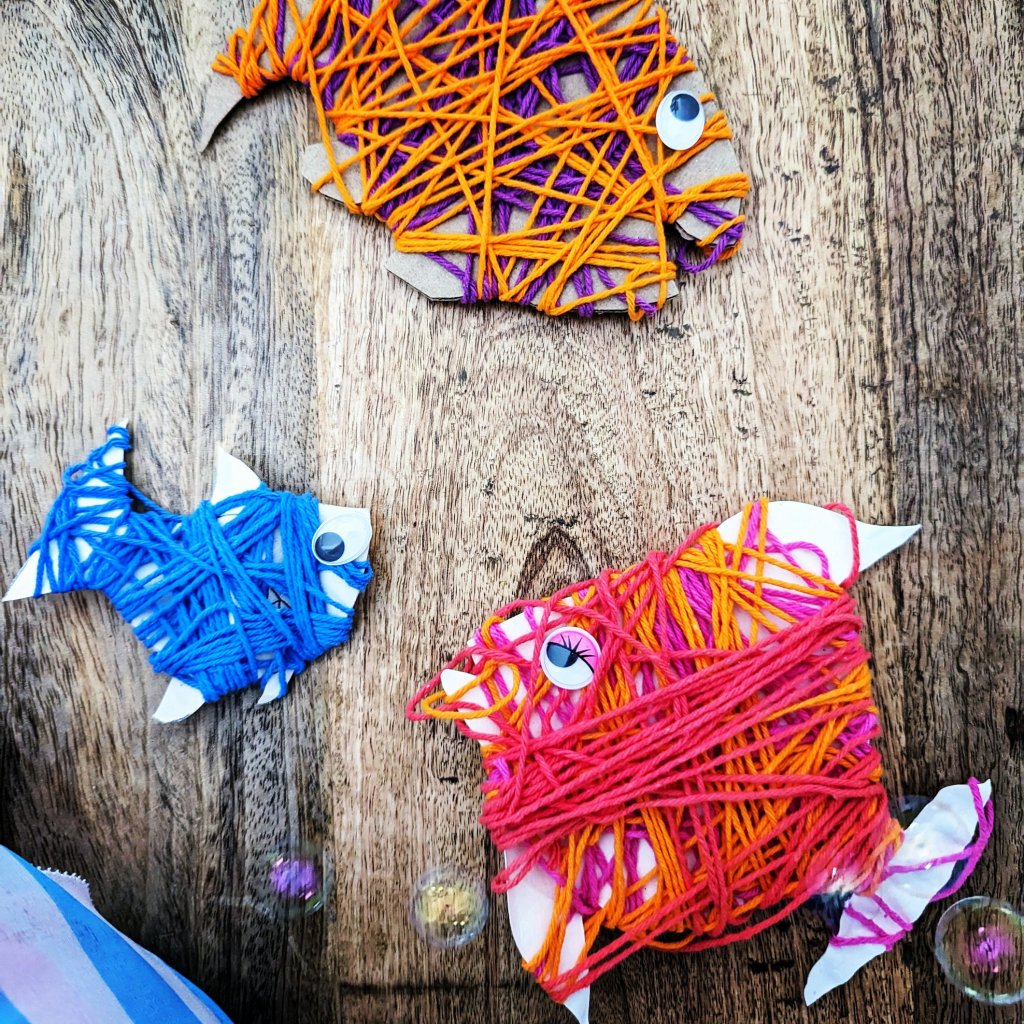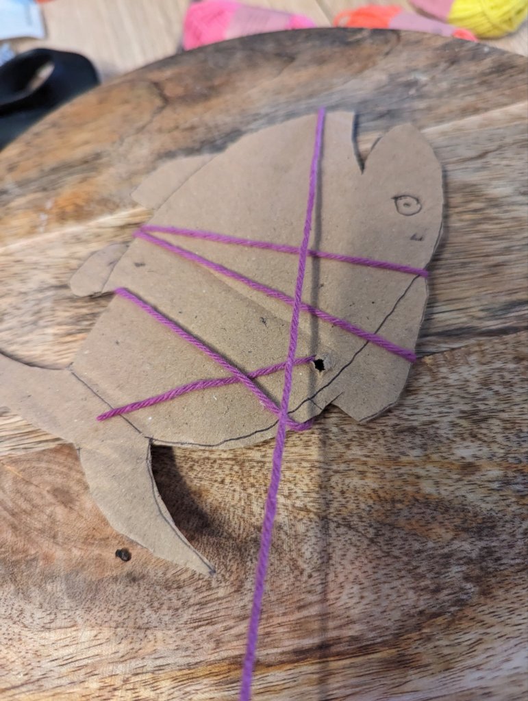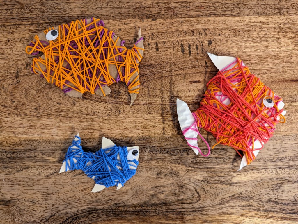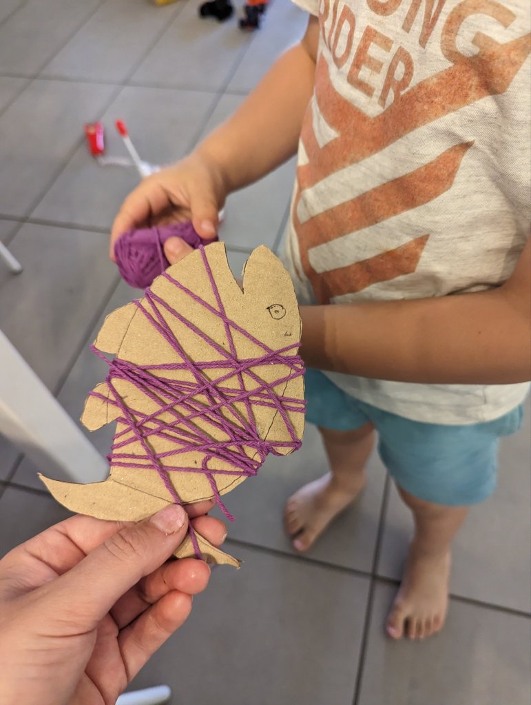 Utilisez un support cartonné pour dessiner votre poissonDécoupez le contour Choisir des petites pelotes de couleur Vous pouvez débuter en attachant avec un petit nœud la ficelle.Entourez le poissonVous pouvez aider votre enfant N’hésitez pas à superposer plusieurs couleurs Tapez forme de dessin oisson sur Google pour être inspiré !