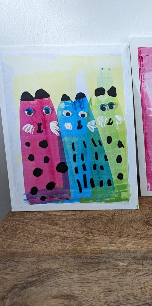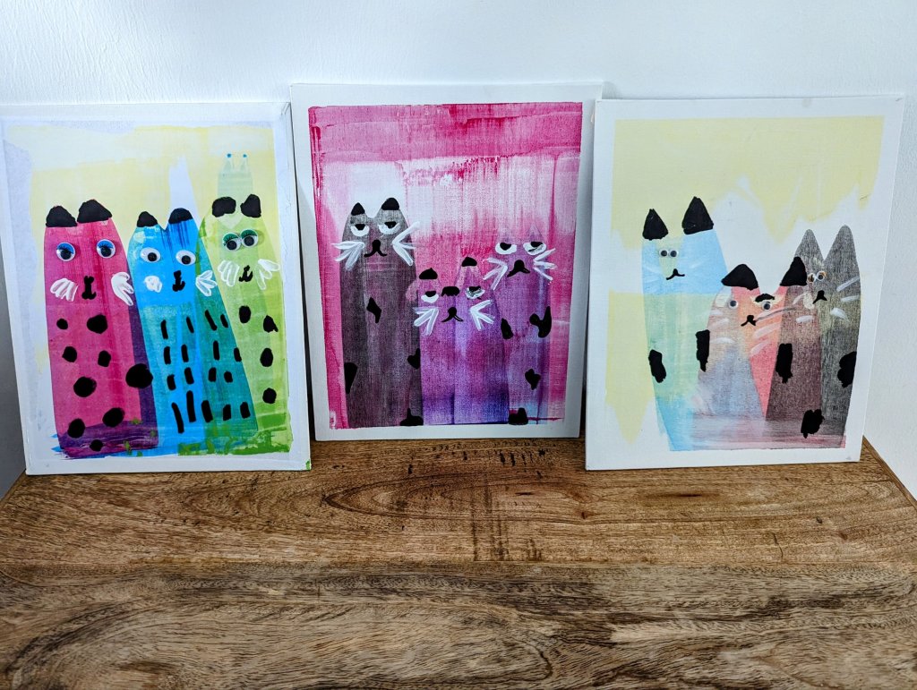 Pour réaliser les chats, faire à la peinture un M avec la pointe du milieu un peu aplatie. Puis passer la raclette. Procédez chat par chat.