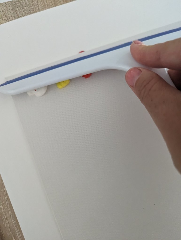 J’ai utilisé une raclette à vitre. Il faut de préférence mettre une couleur claire en fond.