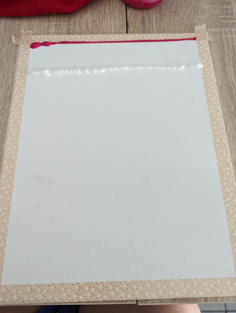 Commencez par faire le tour d’un tableau avec du masking tape. Puis le long en haut, déposez de la peinture. Avec une raclette, appuyez pour faire descendre la peinture.