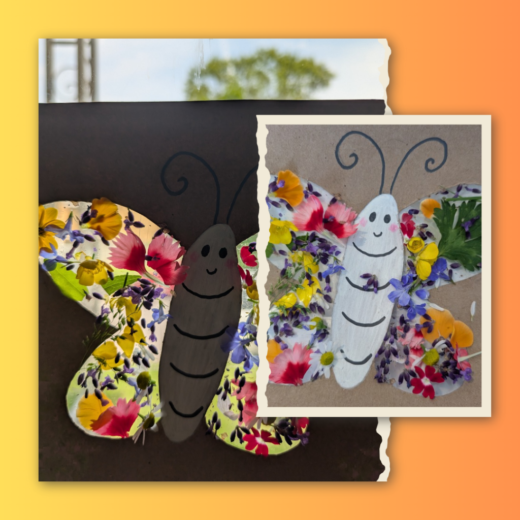 Et voilà ! Après avoir collé les fleurs sur les ailes, on a ajouté une touche brillante : un peu de papier collant transparent pour sceller le tout… et accroché notre papillon à la fenêtre. ☀️