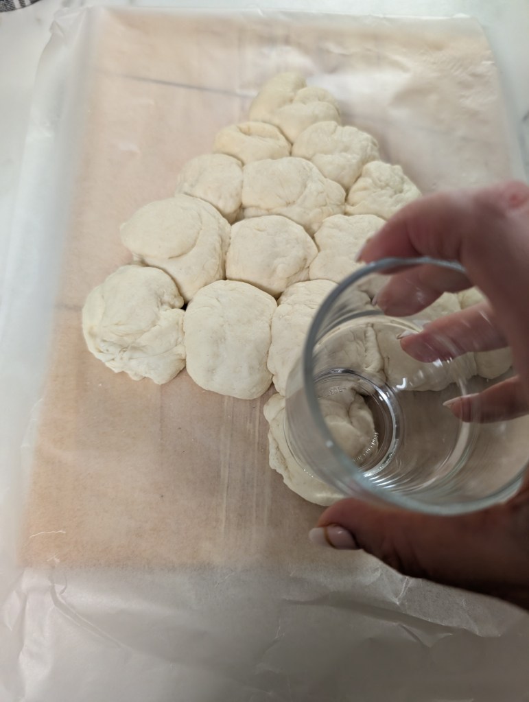 Aplatis légèrement la boule avec la paume de la main ou un fond de verre, juste un peu, pas trop fin.